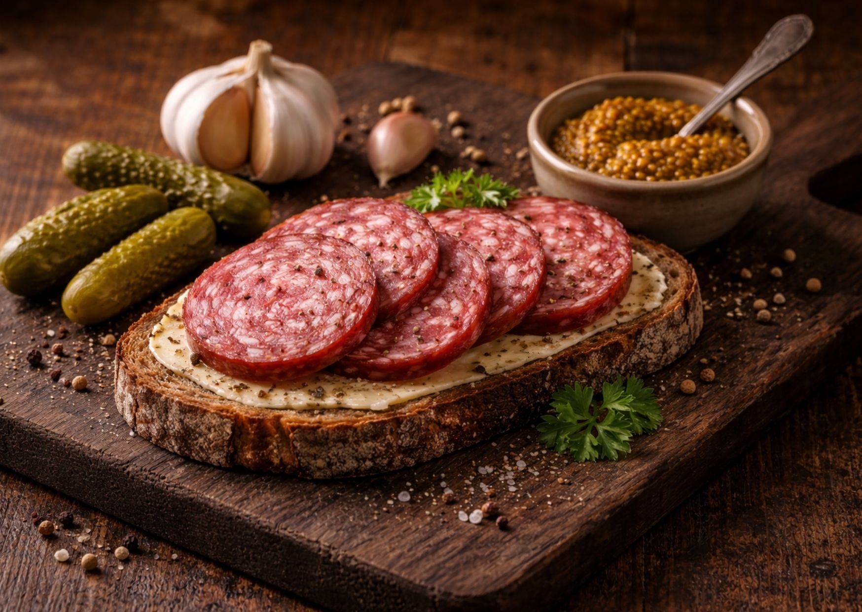 Die Kombination aus traditioneller Buchenholzräucherung und dem würzigen Knoblauch ergibt ein Geschmacksprofil, das gleichzeitig rustikal und raffiniert ist – perfekt zur Brotzeit, auf dem Vesperteller oder als charaktervoller Gast auf der Wurst- und Käseplatte.